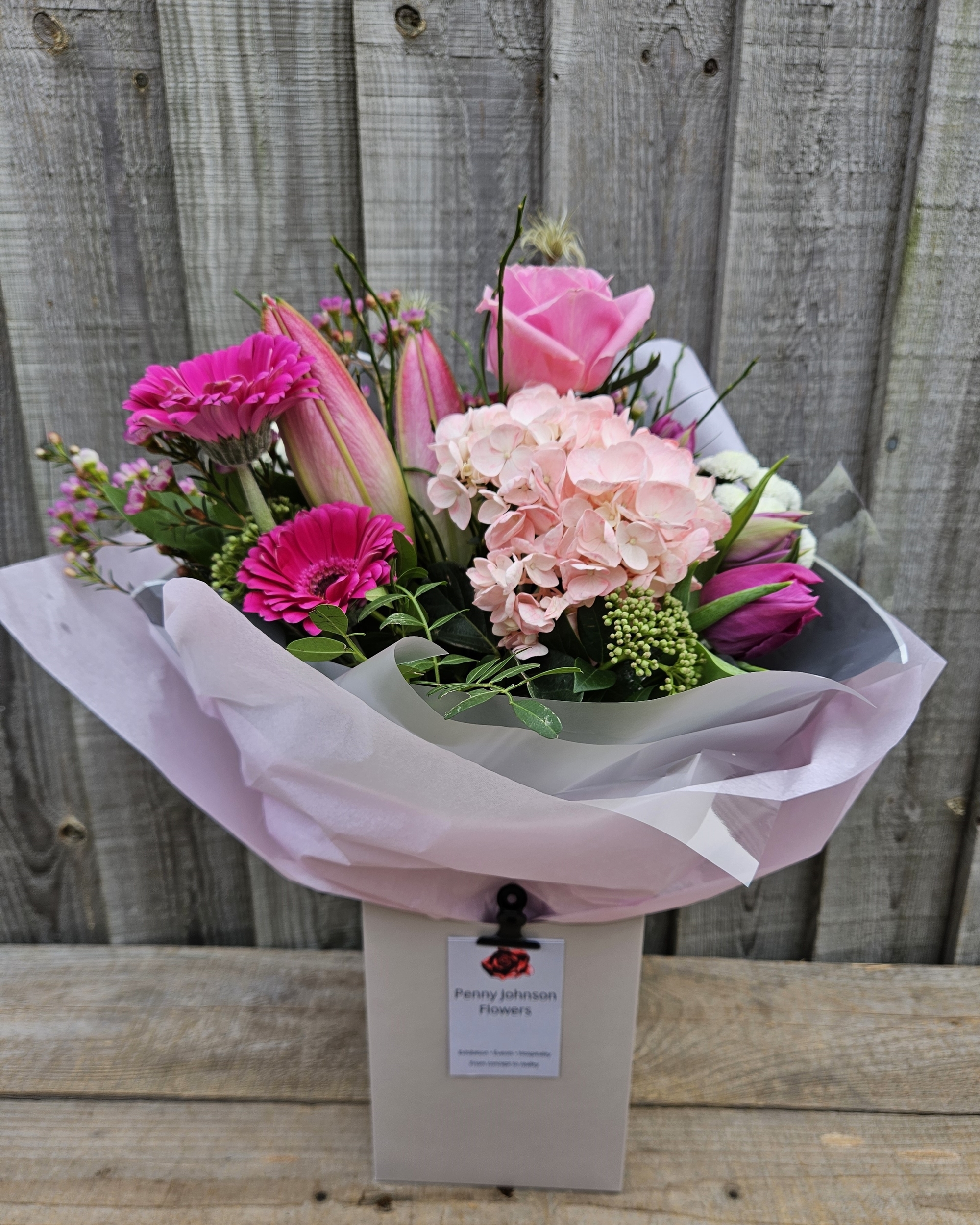 A gorgeous mix of pink blooms in varying shades from blush to cerise, hand tied and gift wrapped in our taupe gift box.