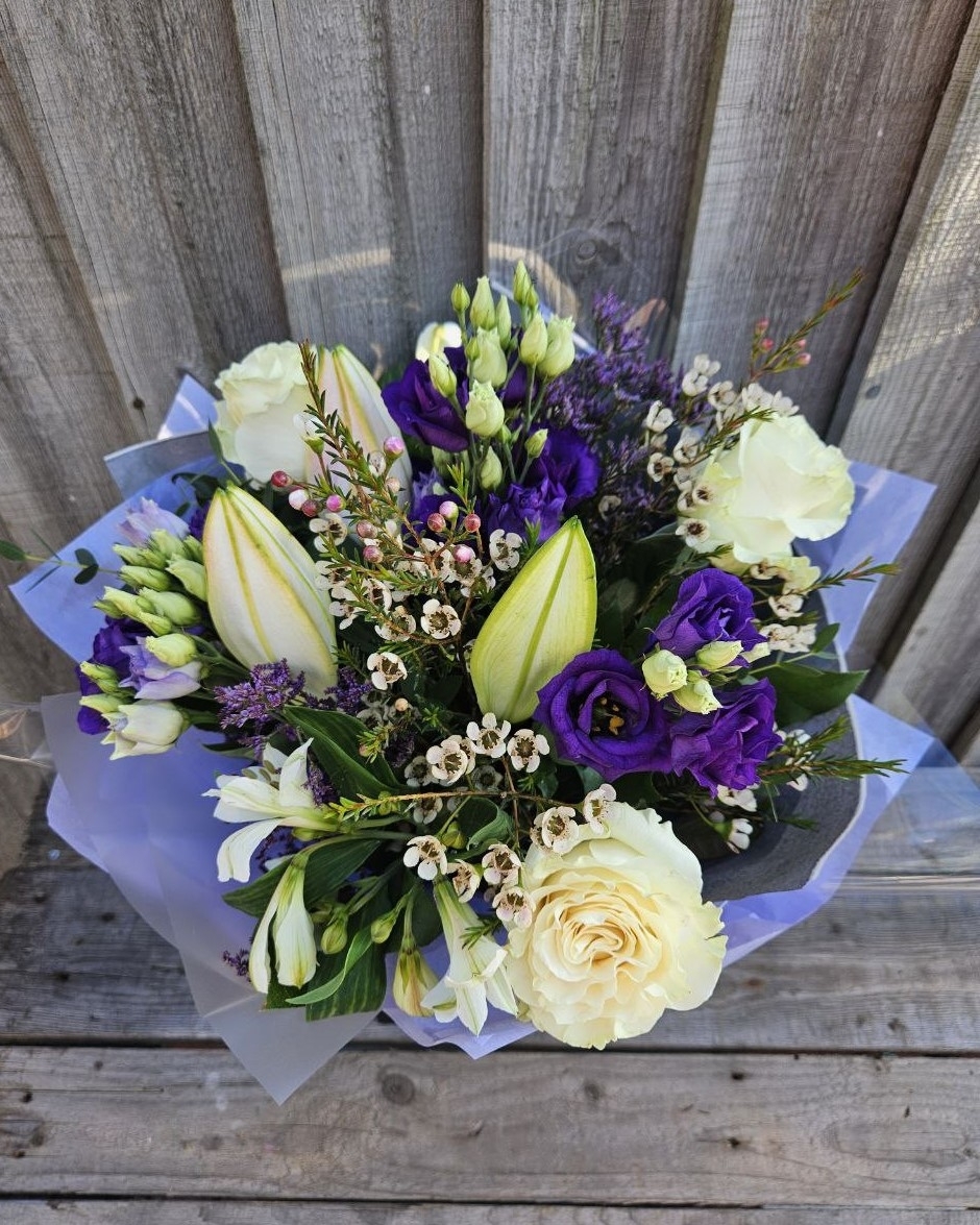 A Pretty Selection Of White Oriental Lily, Pale Pink Roses, And Purple Eustoma, With Salal Eucalyptus And Aspidistra