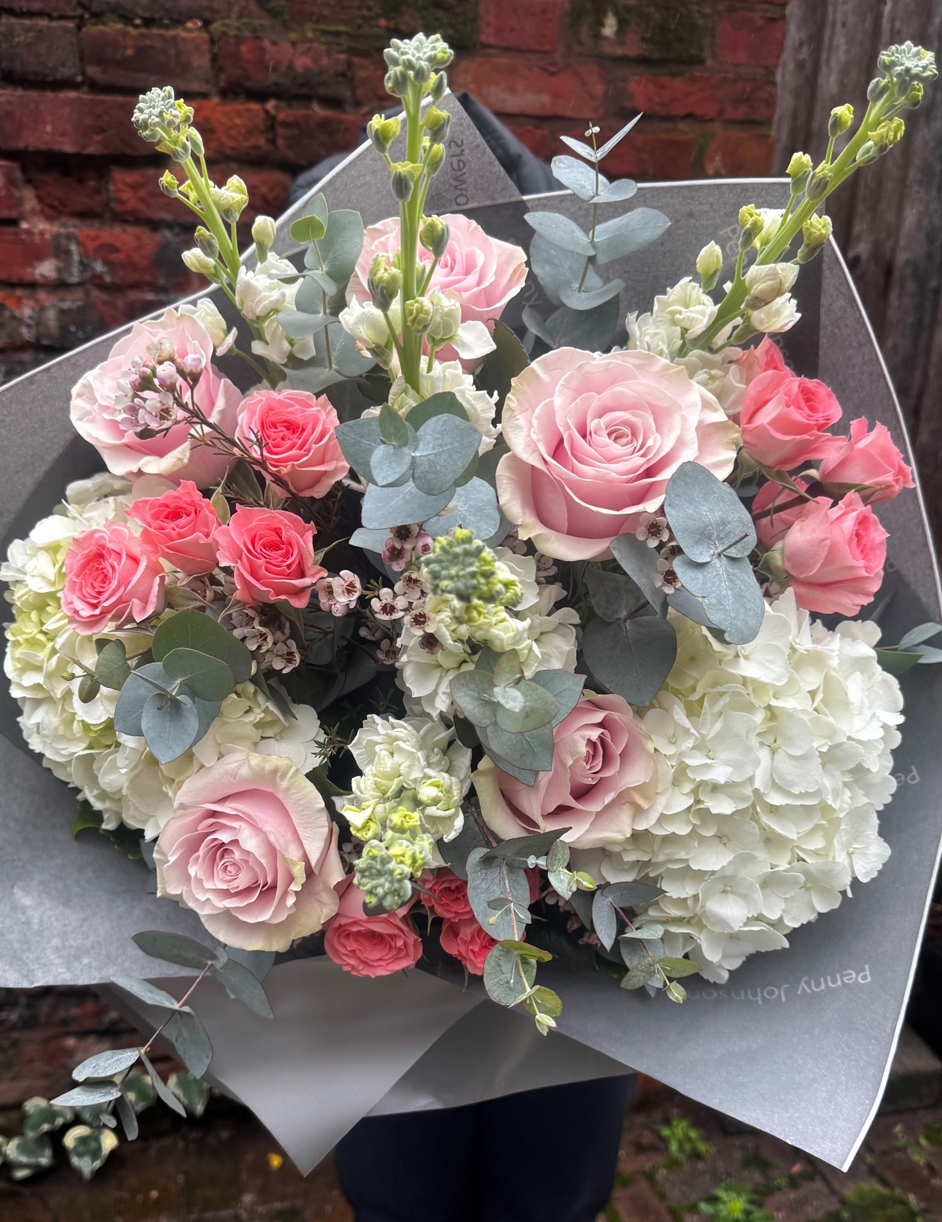 a beautiful hand tied bouquet of stunning pink and ivory booms fincluding large bloom blush roses, pink spray Roses, wax flower Hydrangea mixed foliages and Eucalyptus