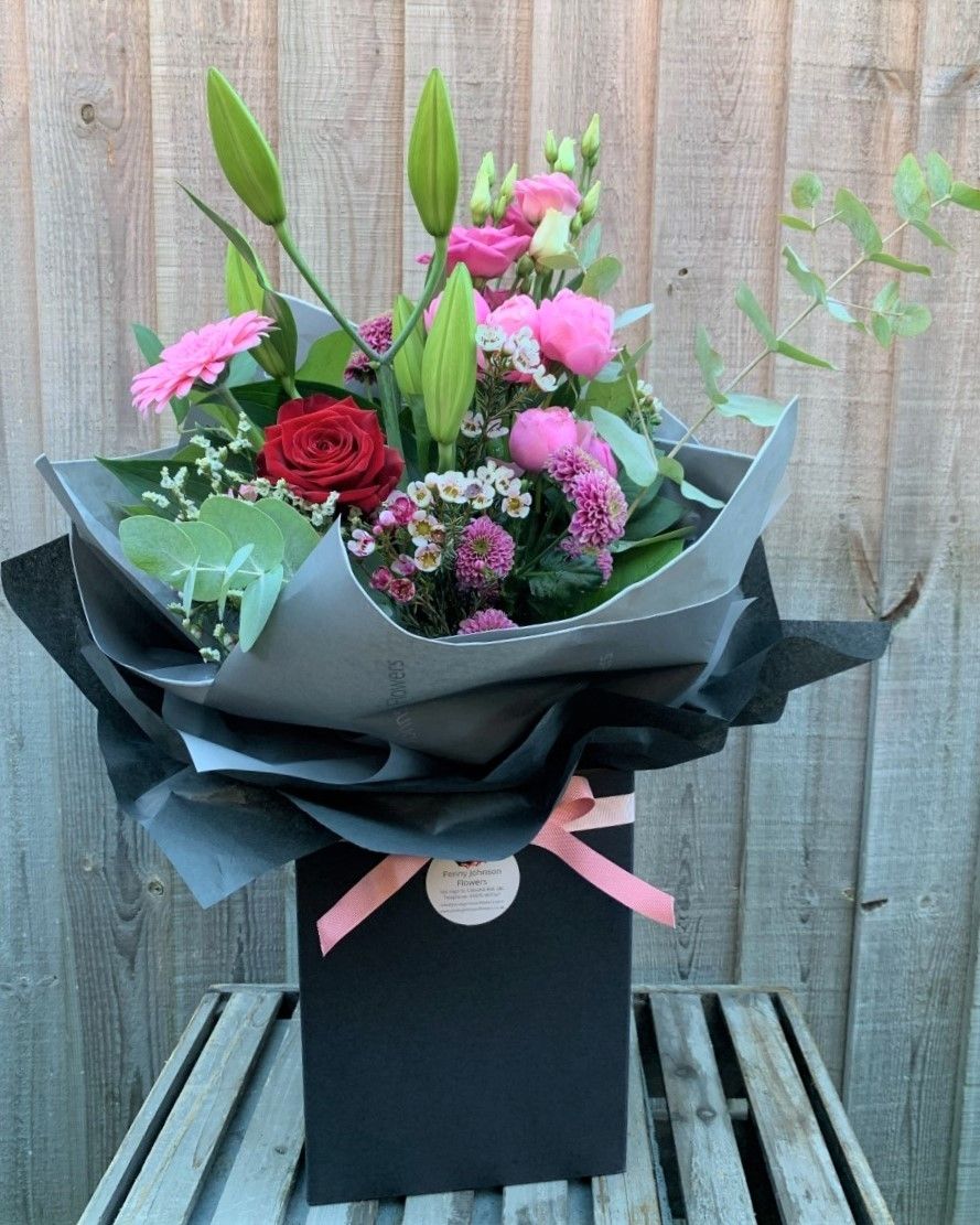 A beautiful mixed bouquet in pinks and whites with a single red rose to the centre. hand tied and gift wrapped in our signature paper and gift box.