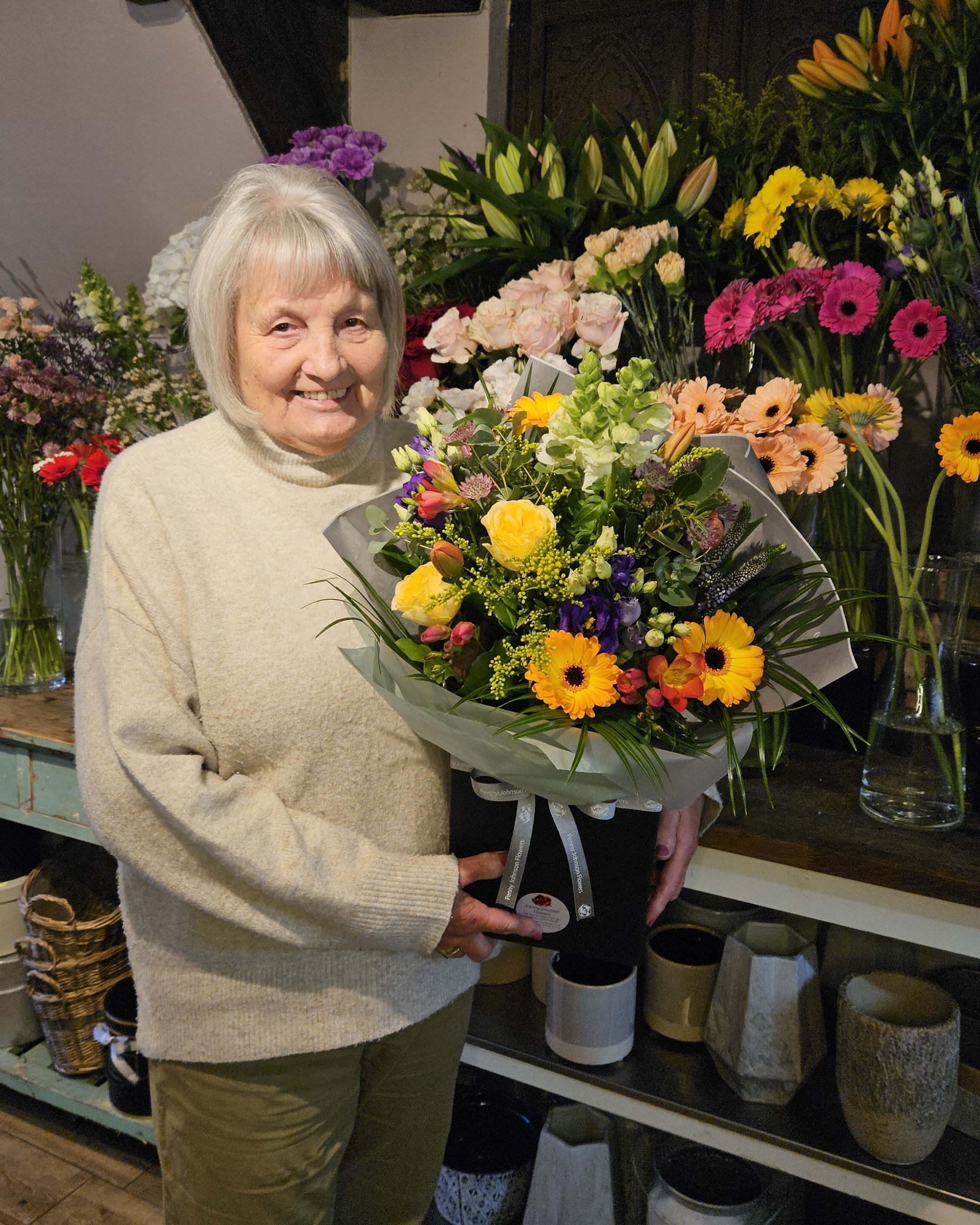 The Signature Jean Bouquet ( Named after Penny's Mom Jean) features a vibrant mix of Yellow Roses, Purple Lisanthus, pink Santini, Orange Freesia, Yellow Germini and solidaster, with Eucalyptus and Plam leaf.
