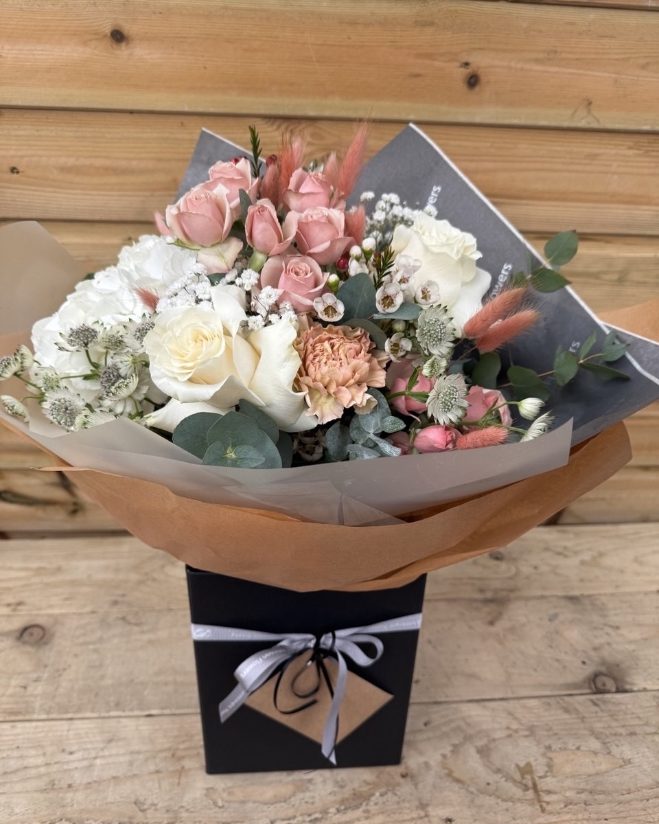 A beautiful selecton of ivory and caramel flowers, featuring Roses, Hydrangea, Gypsophila, ivory Astrantia, waxflower, caramel Carnation, spray Rose and Bunny Tails . Hand tied and gift wrapped in our signature packaging.