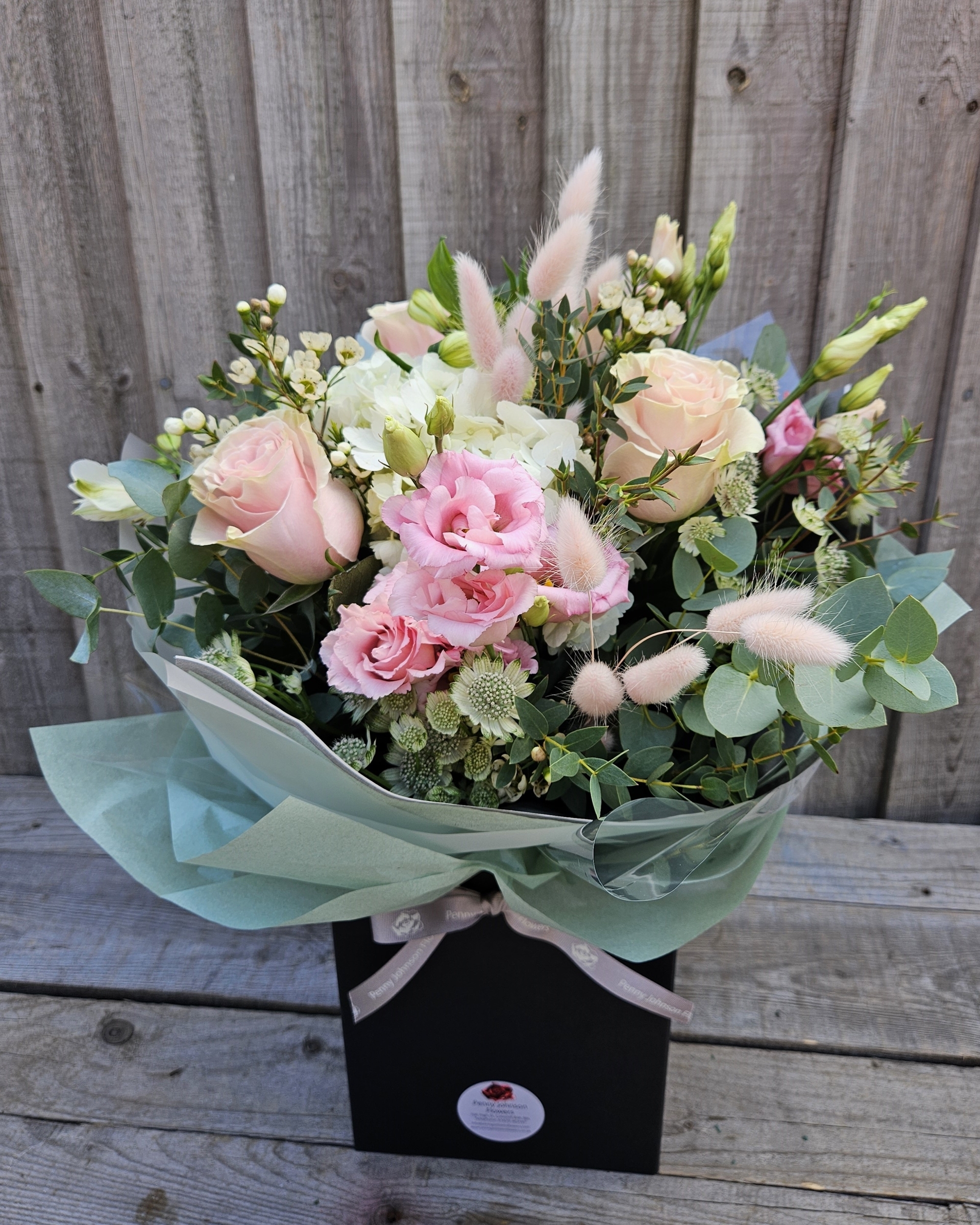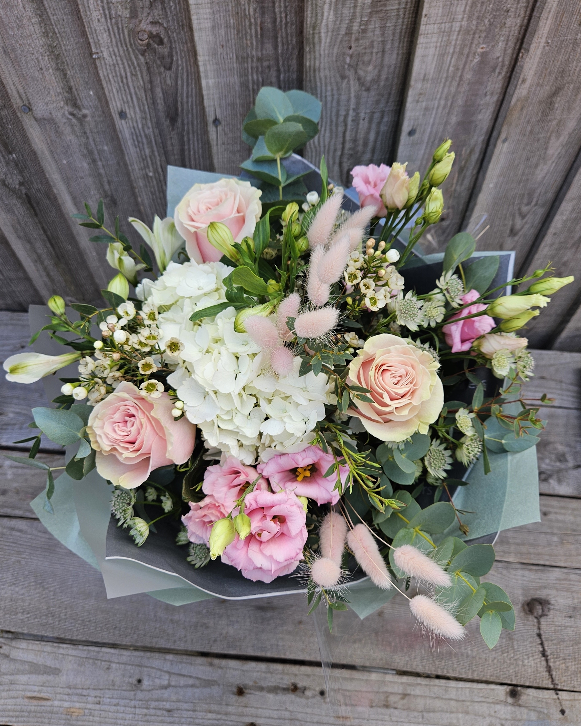 The Signature Jaimi Bouquet features blush Rose, pink Hydrangea, pink Lisianthus, and Astrantia with Eucalptus and Palm Leaf.