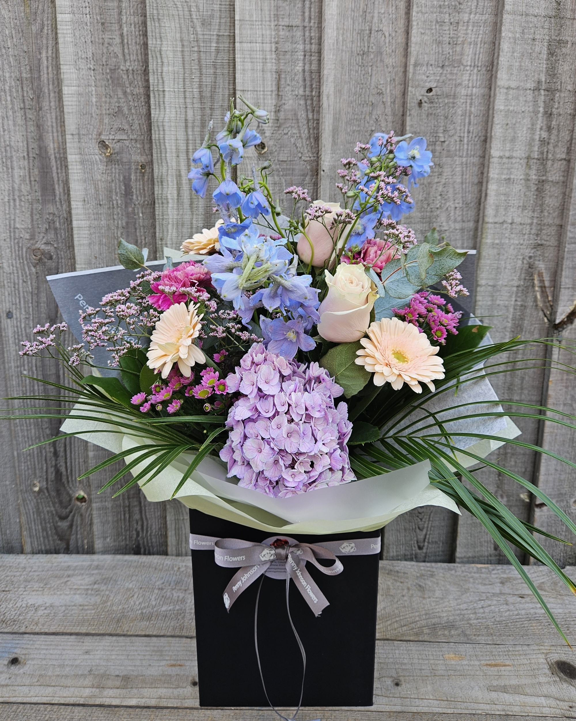 A pastel mix featuring Pale Blue, Pinks, ivory and Peach flowers hand tied and displayed in our signature PJF gift wrap and presented in an aqua gift box